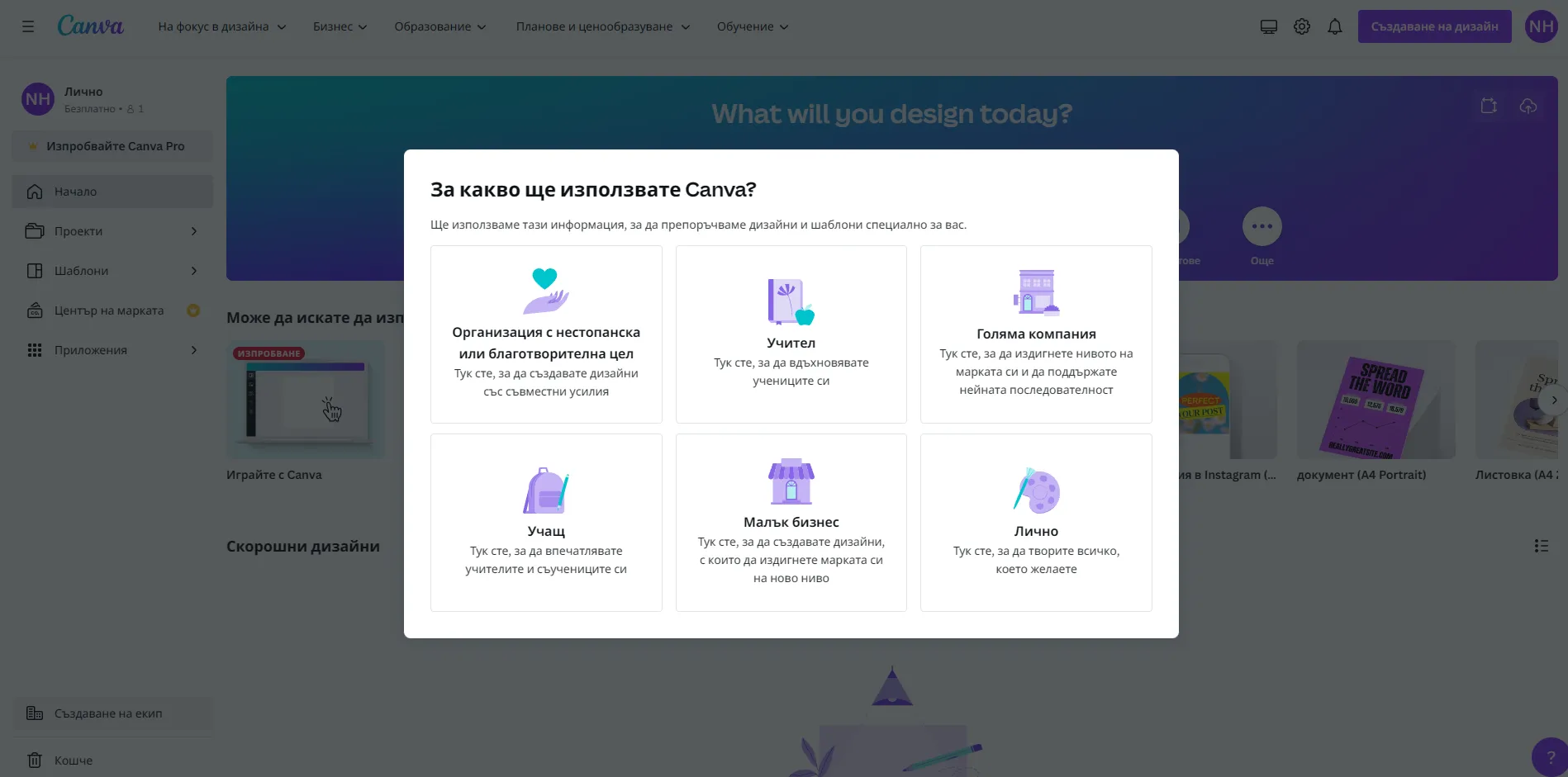 По подразбиране, всеки нов потребител в Canva използва нейната безплатна версия. Тя, обаче, е доста ограничаваща – много от темплейтите не са налични за безплатни потребители, както и огромна част от библиотеките със снимки, илюстрации и фигури. Инструменти като Background Removal, също не са налични. Именно затова безвъзмезните абонаменти за НПО за Pro версията са толкова ценни – те ни позволяват напълно свободно и без пречки да използваме платформата с всичките й придобивки и да създаваме страхотни дизайни всеки път.