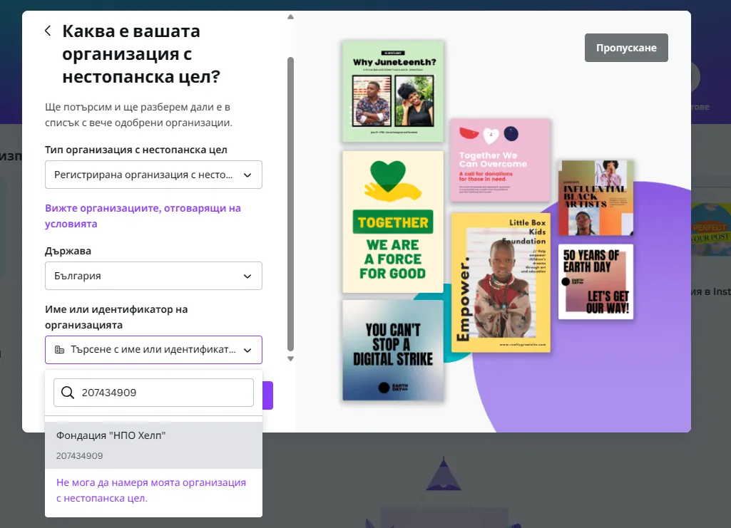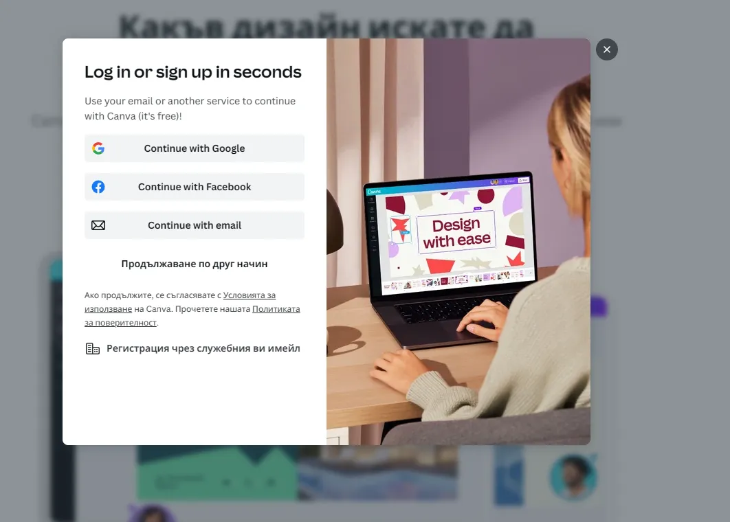 Стъпка 1: за да кандидаствате е необходимо да имате профил в Canva, като най-добре е той да бъде регистриран на ваш работен e-mail адрес към фондацията/сдружението ви. В нашия случай – регистрирахме нов профил с имейл адреса [email protected] – по този начин показваме, че сме истински служител/член на организацията. За по-голямо удобство, ако имате Google профил с работния ви имейл адрес, използвайте опцията „Continue with Google“ – така няма да се налага да помните поредната парола. 😎